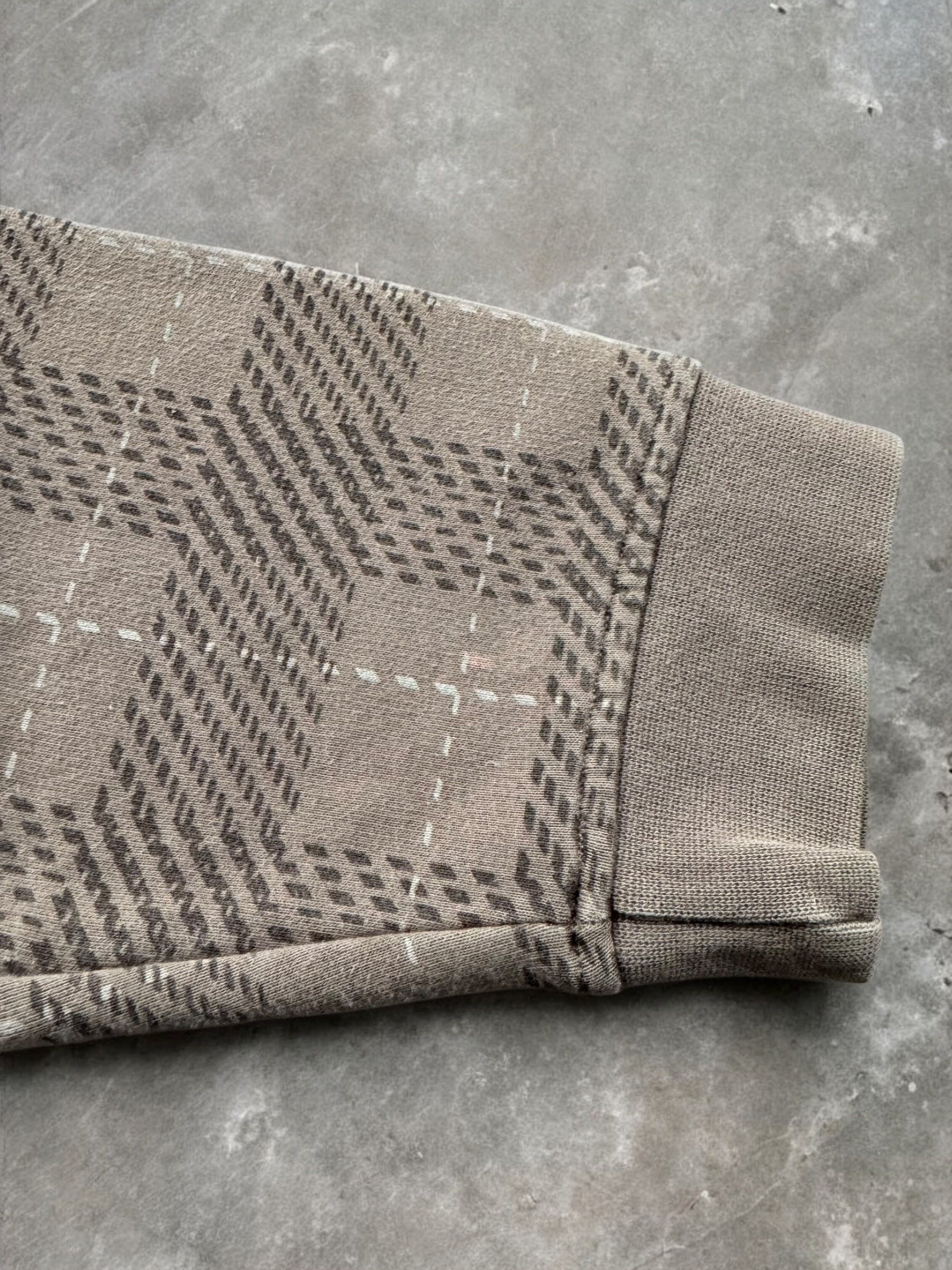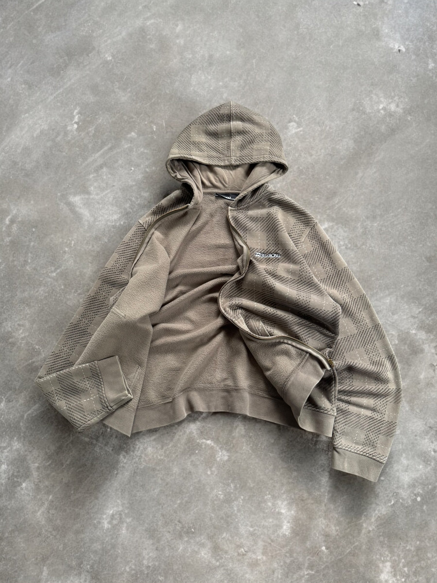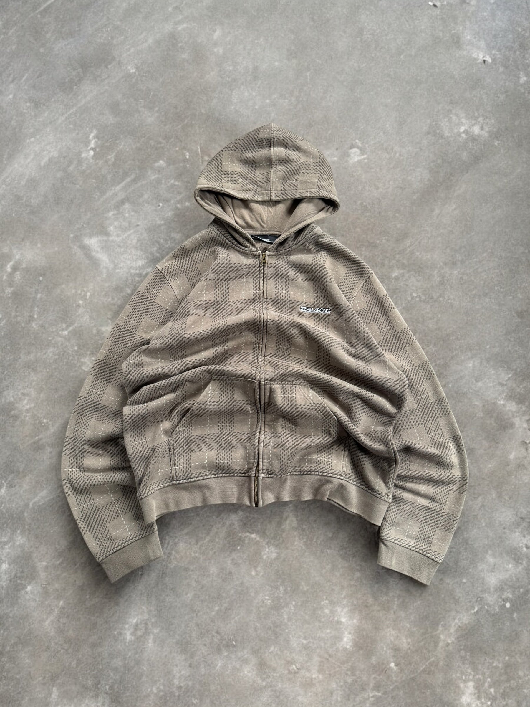 Featuring embedded all over checkered design, embossed zipper, elasticated waist and cuffs, boxy fit on body and logo at the back and embroidered spell out on chest.