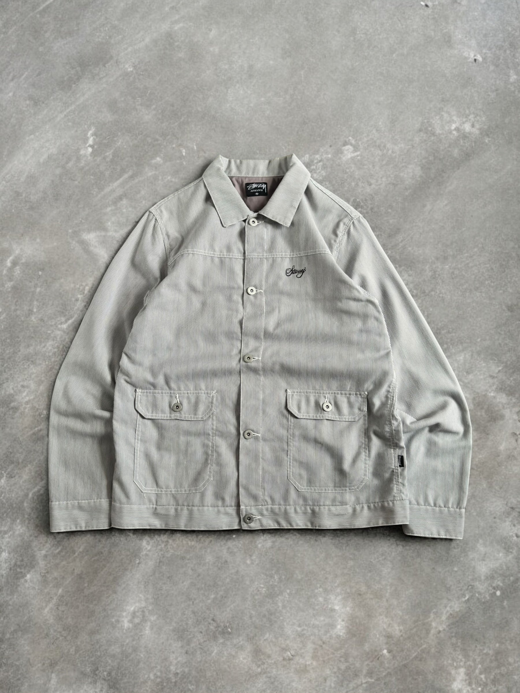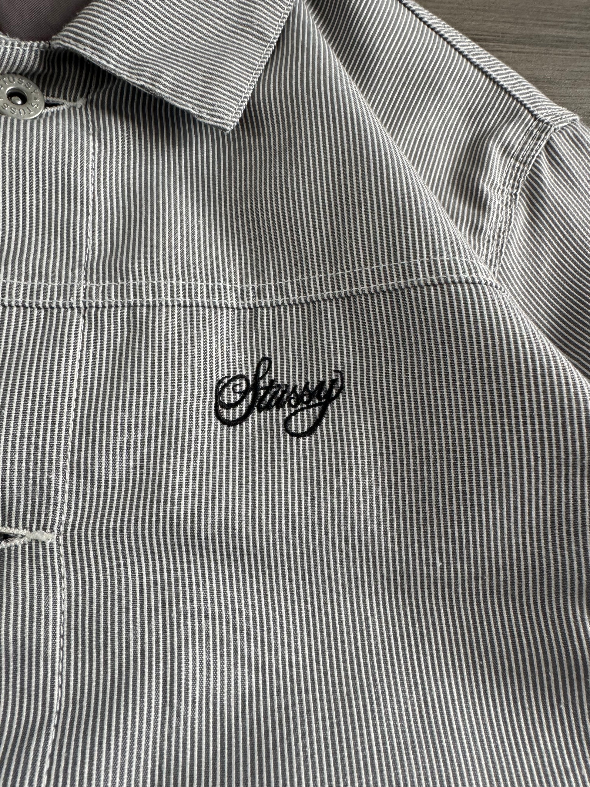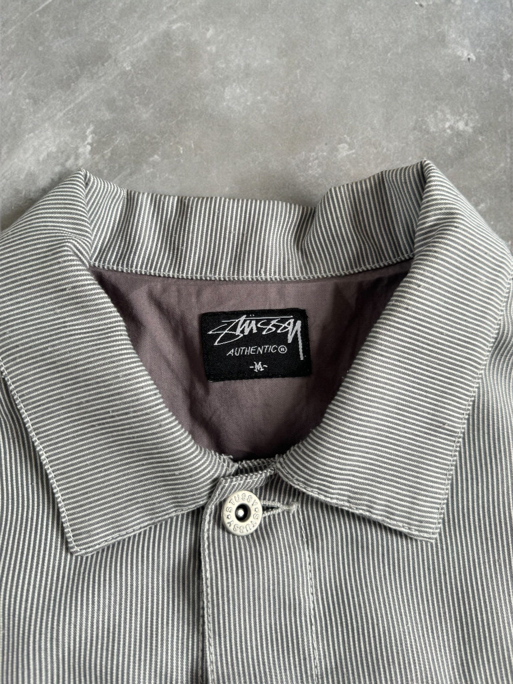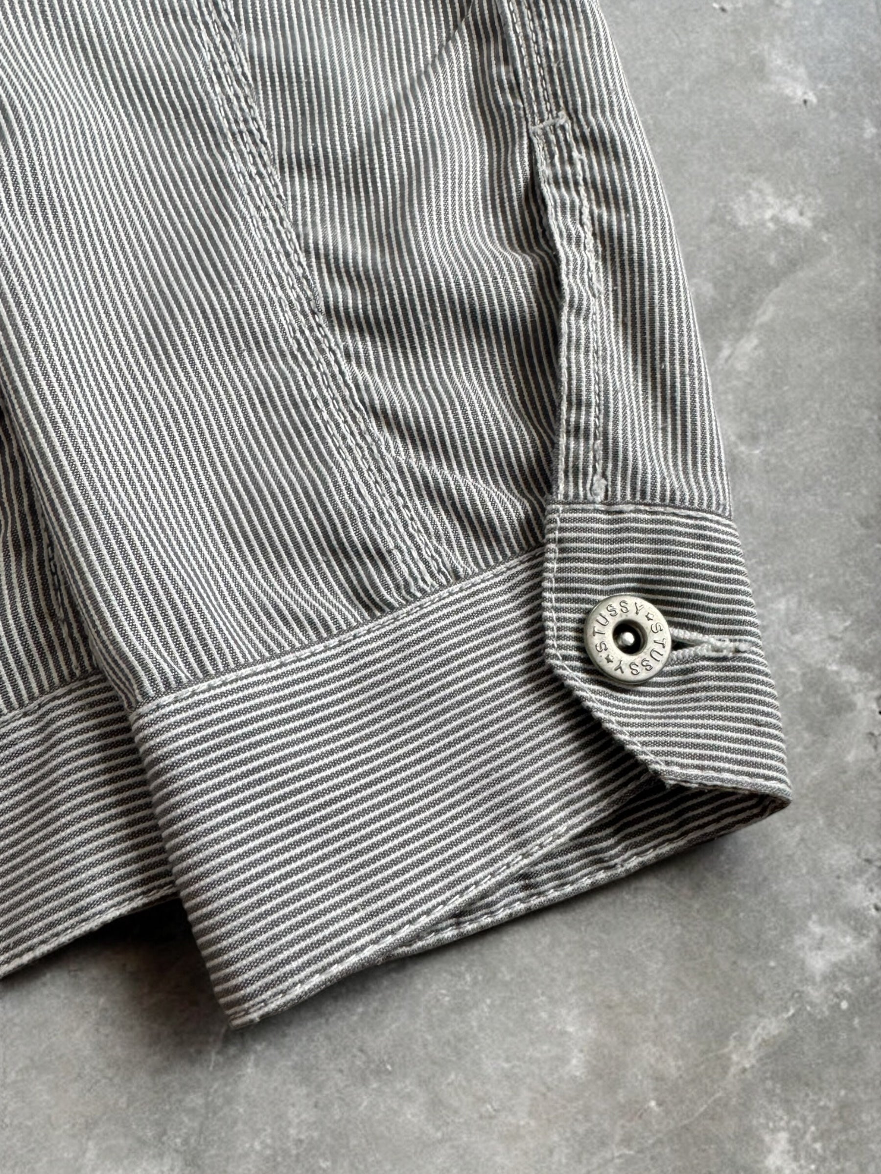 Vintage 2000's grey and white striped Stussy collared chore jacket (M)
