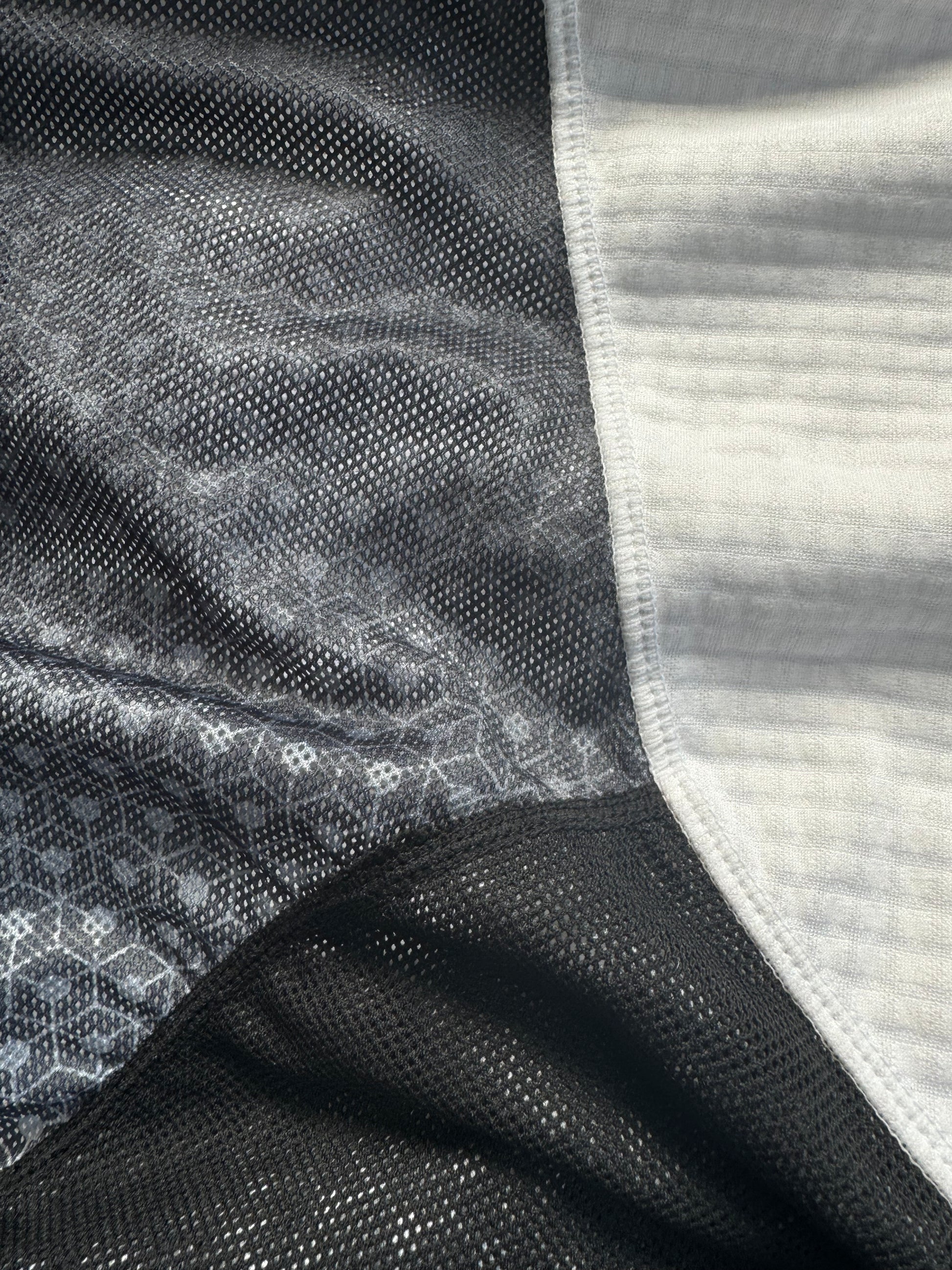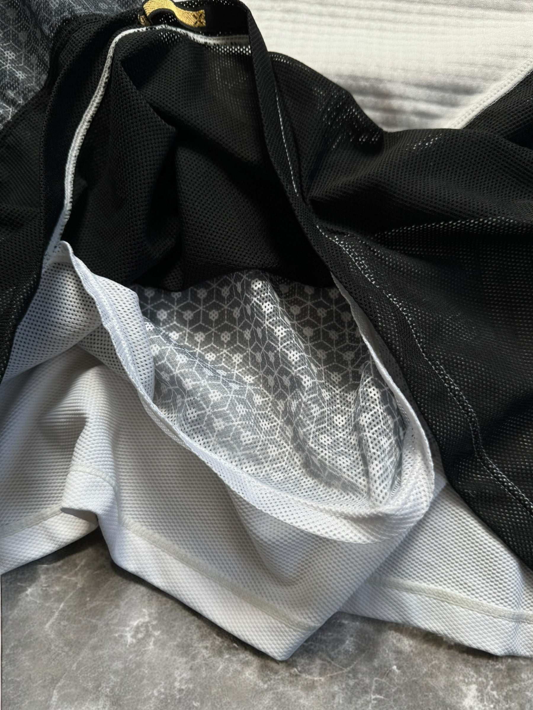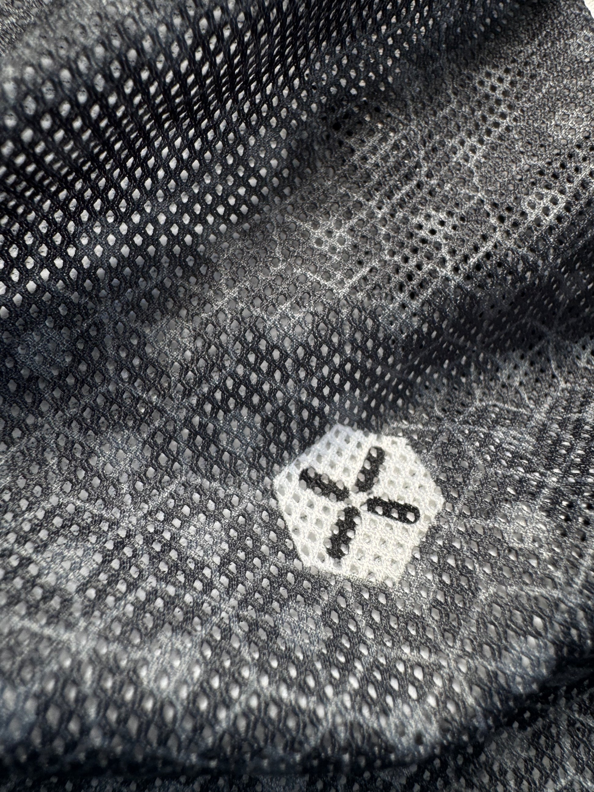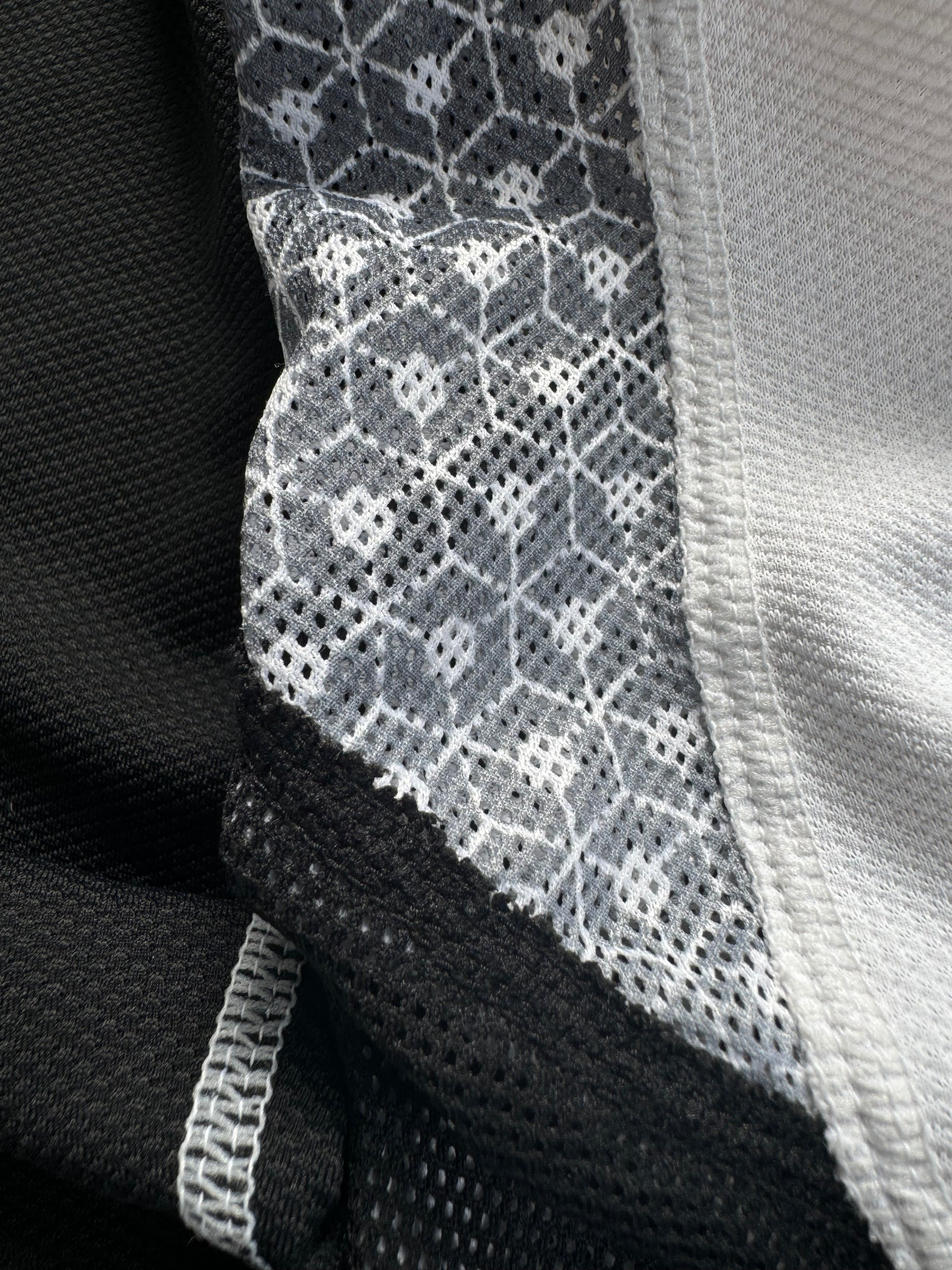 Featuring triple layer mesh, cut and sewn articulated panels that match the human anatomy. Gold accents and breathable technology. Waffle knit upper material and a mixed graphic throughout.
