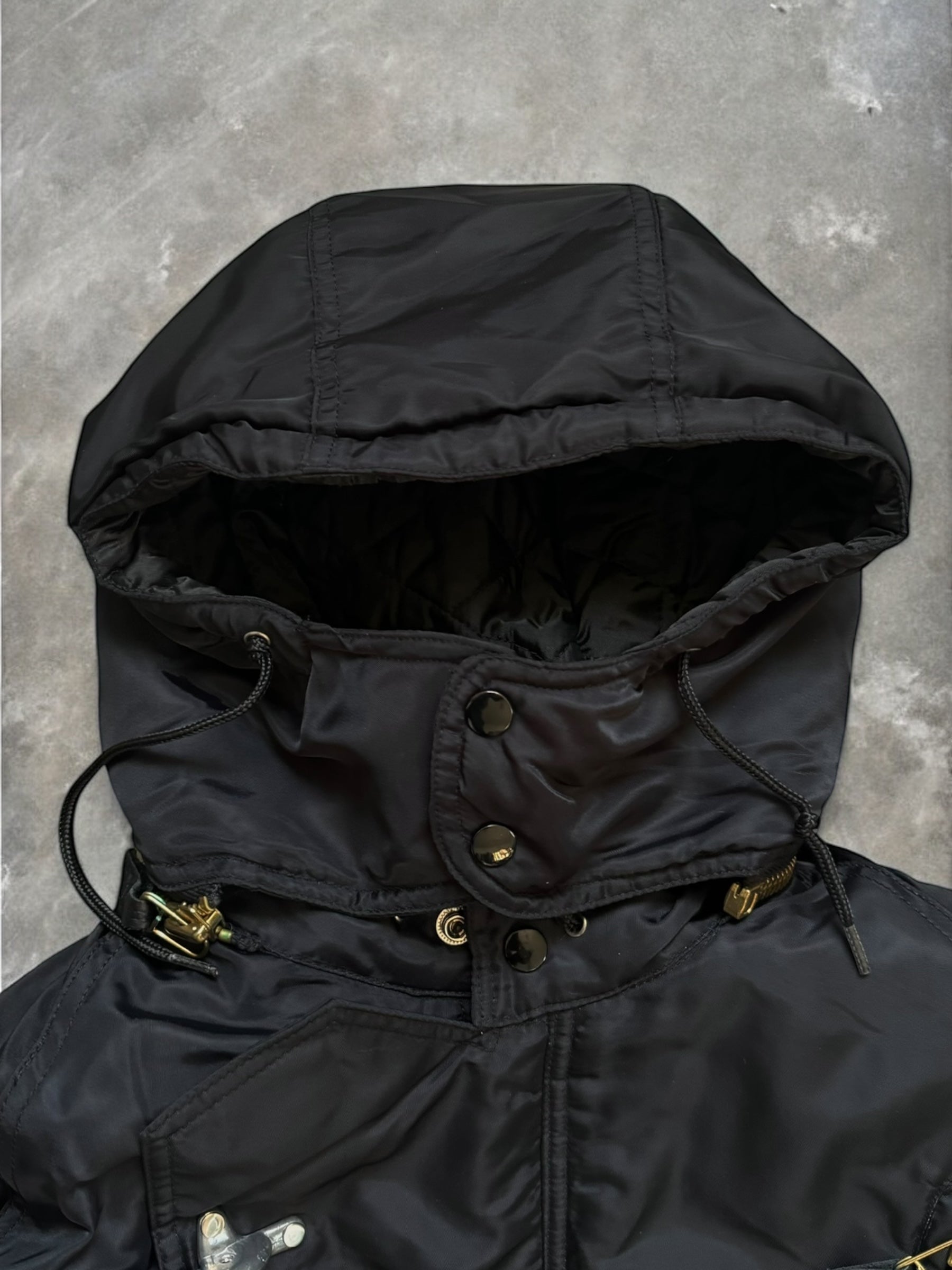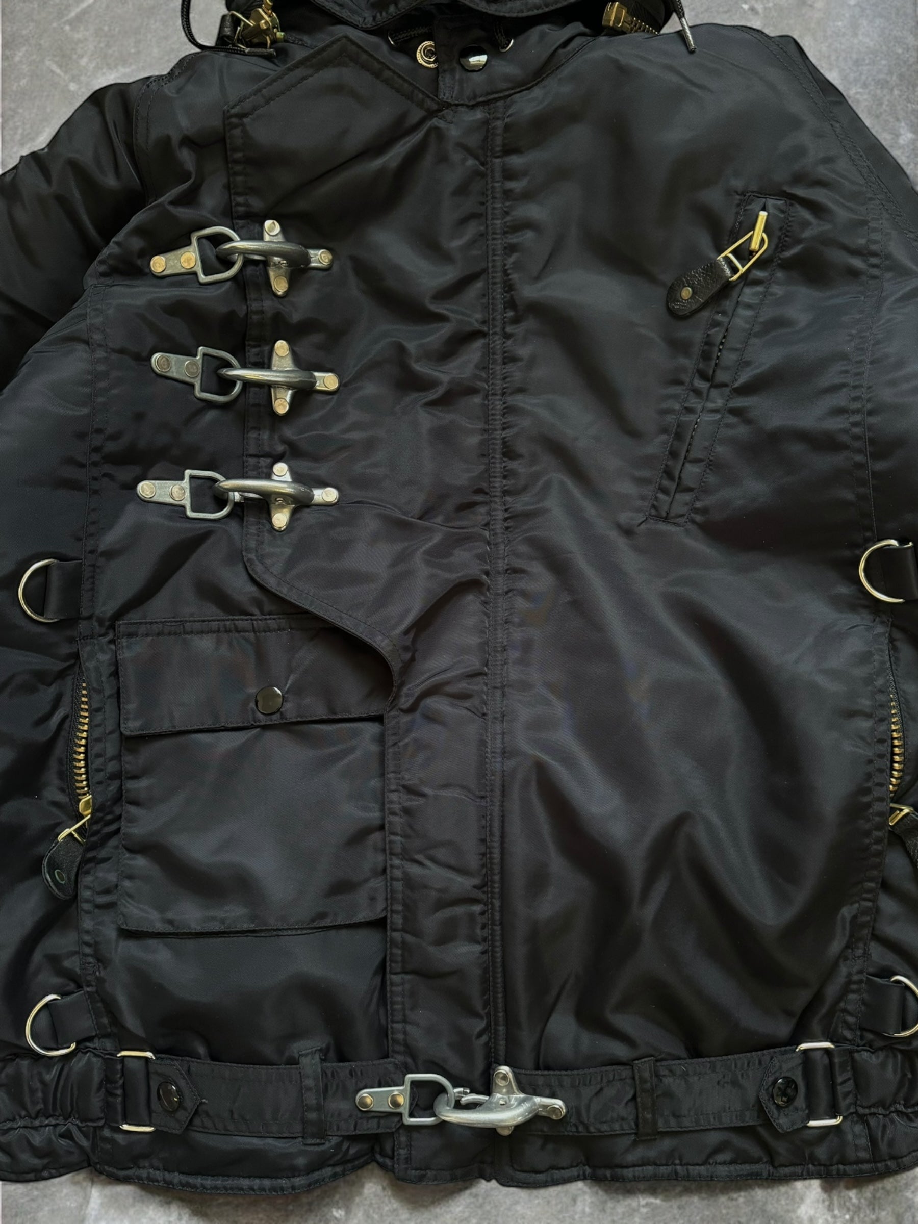 Featuring high quality construction and materials, silver metal hardware that includes super heavy fireman's clasps staggered at the front of the jacket, diamond stitch inner lining, detachable hood and multi pocket system